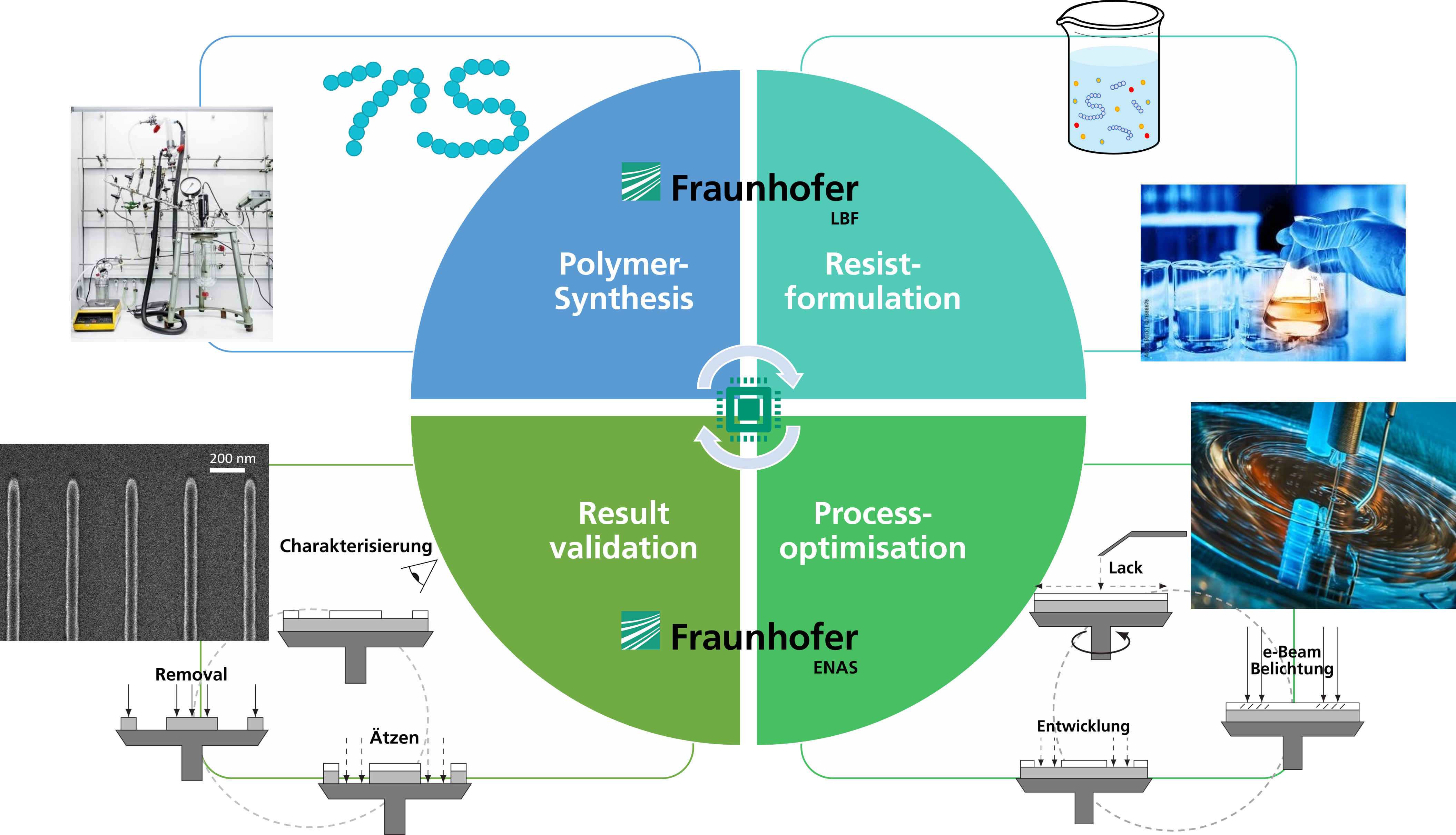 The Fraunhofer Institute for Structural Durability and System Reliability LBF contributes its comprehensive expertise in the synthesis of new, demand-oriented polymers with well-defined compositions through controlled and living polymerizations to the project. These expertises include the production of polymers with specific polymer architectures, such as block and graft copolymers as well as star polymers, and the manufacturing of polymers with a narrow molecular weight distribution. Fraunhofer LBF already holds patents for the synthesis of resist polymers. These core areas of expertise are essential for the development of new resists that are precisely tailored to the manufacturing process and are designed to achieve high resolutions with increased sensitivity.